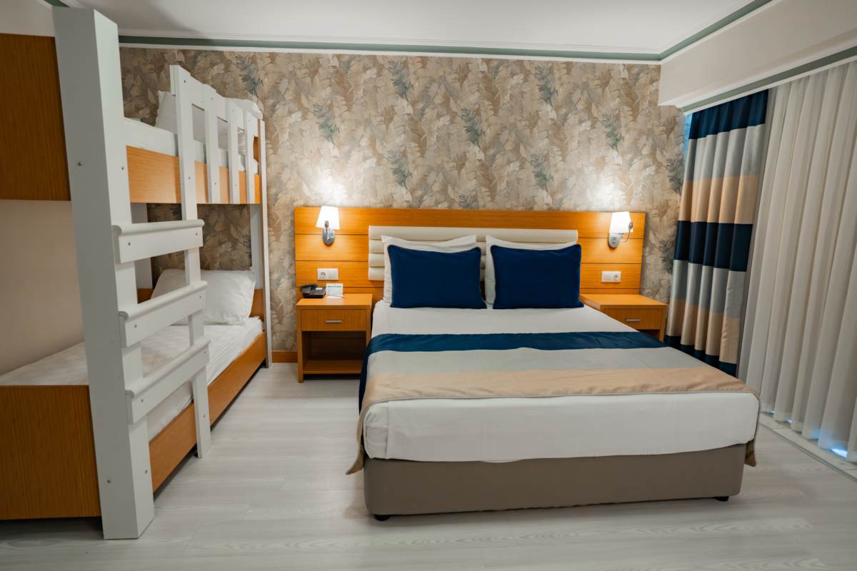 Toplam 37 adet olan ranzalı odalarımız, 24 m² genişliğe sahip olup, aile konaklamalarınız için ideal bir seçenektir. Odalarımızda bir banyo, bir çift kişilik yatak ve bir ranza bulunmaktadır. Bahçe manzarası eşliğinde, sevdiklerinizle keyifli ve huzurlu anılar biriktirmeniz için tasarlanmıştır. Ailenizle geçireceğiniz unutulmaz bir tatil için sizi bekliyoruz.
